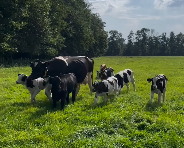 Wenn wir zurückschauen auf das landwirtschaftliche Jahr 2024, dann gucken wir zunächst auf ein unglaublich nasses Frühjahr. Es hat sehr viel geregnet, was den Ackerbau und auch die Grünlandwirtschaft zu einer echten Herausforderung gemacht hat, da die Bearbeitungszeitfenster häufig sehr klein waren. Man konnte unsere Stresstoleranz also sehr gut testen, aber das ist ja für uns als Eltern kleiner Kinder eh kein Problem. Unsere beiden Hauptkulturen Gras und Mais finden viel Regen auf jeden Fall gut und den Kühen ist ein nasskalter Sommer auch viel lieber als ein heißer und trockener. Deshalb hüten wir unsere Zunge, uns zu beschweren, und genießen grundsätzlich lieber den Regen. Ein Highlight für uns in der Landwirtschaft im letzten Jahr war auf jeden Fall, als die Ammen zum ersten Mal mit den Kälbern auf die Weide gekommen sind. Die Kälberherde auf der Wiese zu beobachten beim Spielen und Sonnenbaden, da geht uns das LandwirtInnen-Herz auf.