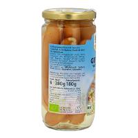 73% Geflügelfleisch* (Pute*, Huhn*)*, Trinkwasser, 10% Sonnenblumenöl*, Geflügelhaut*, Meersalz, Gewürze* (Pfeffer*, Ingwer*, Knoblauch*, Koriander*, Kümmel*), Dextrose*, Schafsaitling, Buchenholzrauch.| Energie | Fett | gesättigte Fettsäuren | Kohlenhydrate | Zucker | Eiweiss | Salz |