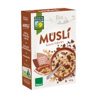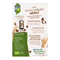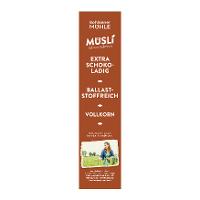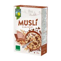 HAFERvollkornflocken* 49 %, VollMILCHschokolade* 20 % (Rohrzucker*, VollMILCHpulver*, Kakaobutter*, Kakaomasse*, Emulgator: Sonnenblumen-Lecithine*), DINKELvollkornflocken*¹ 13%, GERSTENvollkornflocken* 13%, WEIZEN-Kakao-Extrudat* 3 % (WEIZENvollkornmehl*, Weizenmehl Type 550*, Rübenzucker*, stark entölter Kakao*, Meersalz), Getreide-Kakao-Extrudat* 2 % (Reismehl*, WEIZENmehl Type 550*, Rohrohrzucker*, schwach entölter Kakao*, HAFERvollkornmehl*, GERSTENvollkornmehl*, GERSTENmalzmehl*).Energie | Fett | gesättigte Fettsäuren | Kohlenhydrate | Zucker | Ballaststoffe | Eiweiss | Salz |