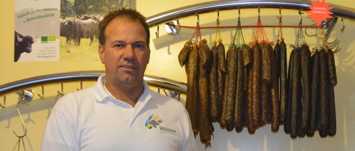 Als erfahrener Biolandbetrieb erzeugt die Fleischerei auf dem Heggehof ausschließlich Produkte auf allerhöchstem Bio-Qualitätsstandard. Die Gesundheit und der Genuss ihrer Kunden waren die Motivation seit 1980 nach strengen ökologischen Maßgaben zu produzieren. Die ökologische Fleischherstellung zeichnet sich dadurch aus, dass bei der Rezeptur auf Nitrit-Pökelsalz, Phosphat und Geschmacksverstärker verzichtet wird. Angefangen bei der besonders schmackhaften Büffelleberwurst über Klassiker wie hausgemachte Mettwurst nach einem Familienrezept, das bereits seit mehreren Generationen durch einzigartigen Geschmack überzeugt, wird bis hin zu Grillfleisch ein sehr vielfältiges Warenprogramm angeboten. Das Angebot besteht aus weiteren über 70 verschiedenen Wurstsorten und Fleisch vom Rind, Lamm, Schwein, Geflügel und Wasserbüffeln. Neben den Wassserbüffeln aus eigener Aufzucht werden die Tiere von anderen Bioland-Betrieben in der Umgebung verarbeitet und vermarktet. Auch hier stehen die Tier- und Naturliebe im Vordergrund: Eine tierfreundliche, artgerechte Haltung, die die Achtung vor dem Tier und seinen Bedürfnissen berücksichtigt. Das bedeutet: Auslauf im Freien und Ställe mit Tageslicht, frischer Luft und ausreichend Platz.