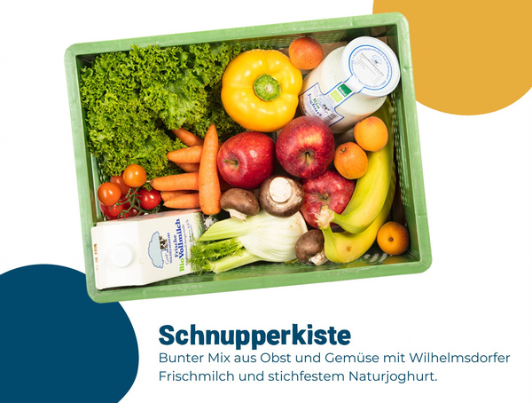 Du kannst unser Angebot ganz einfach mit unseren Schnupperkisten kennenlernen. Entscheide dich jetzt für die Schnupperkiste mit unseren selbst erzeugten Milchprodukten oder für die vegane Variante. Beides bekommst du bei uns für einen Warenwert von ca. 25€. Circa meint, dass wir die Ware, die mit € je kg abgerechnet wird, genau einwiegen. Dadurch ergeben sich nicht genau 25€.