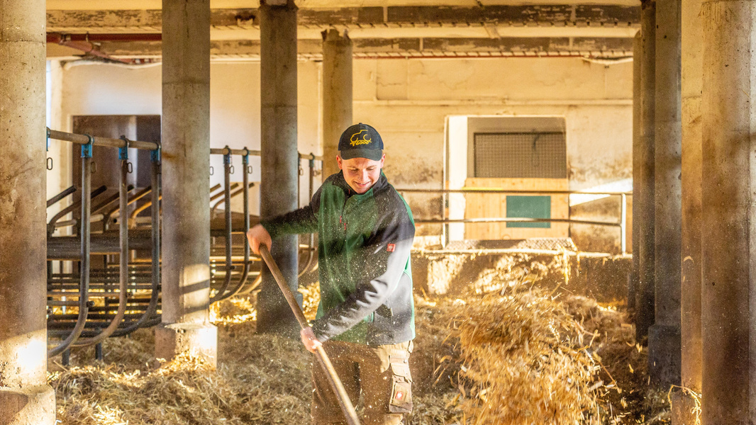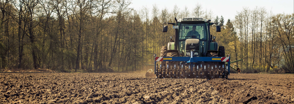 Ackerbau und Grünlandwirtschaft nach Bioland-Richtlinien – das ist gar nicht so einfach, tut aber dem Boden und der Umwelt gut. Denn der Einsatz von chemischen Pestiziden, synthetischen Düngemitteln und gentechnisch veränderten Organismen ist bei uns tabu. Uns reicht die Natur wie sie ist. Durch die Nutzung natürlicher Regulationsmechanismen halten wir Wildkräuter und Schädlinge in Schach. Entscheidend ist dabei die Fruchtfolge, die wir auf unseren Flächen einhalten: Am Anfang steht das zweijährige Kleegras als bodenaufbauende Frucht. Dann folgen die Starkzehrer Mais und Kartoffeln, im folgenden Jahr Roggen und Triticale mit Zwischenfrucht, danach ein Lupinengerstengemenge oder Mais und noch mal der eher anspruchslose Roggen mit anschließender Zwischenfrucht. Erneut beginnt dann der Zyklus mit der Aussaat des Kleegrases unter der Deckfrucht Sommergerste. Als abfrierende Winterzwischenfrüchte setzen wir Ackersenf oder Ölrettich ein. Als Futterzwischenfrüchte säen wir Landsberger Gemenge (bestehend aus Zottelwicke, Inkarnatklee und Welschem Weidelgras) oder Einjähriges Weidelgras aus. Gedüngt wird immer in kleinen Gaben mit unserer eigenen Biogasgülle. Sie wird zu Beginn und während der Vegetation schonend und emissionsmindernd mit Schleppschläuchen oder Schleppschuhen ausgebracht und sorgt für ein gesundes Wachstum der Pflanzen. So schließt sich der Nährstoffkreislauf im Betrieb. Die meisten Kulturen, die wir ernten, nutzen wir als Futter für unsere Kühe und Jungrinder. Kartoffeln und Brotroggen dienen natürlich direkt der menschlichen Ernährung. Durch die Vielfalt auf unserem Acker und die Anbaupausen für die jeweiligen Früchte reicht es aus, unsere Kulturen mit Netzegge und Hacke sauber zu halten – und das letzte Kräutlein wollen wir ja auch gar nicht erwischen. Eine leichte Wildkrautflora bietet Insekten und anderen Lebewesen einen wichtigen Lebensraum. Jetzt könnte man meinen, Ökolandbau ist die Landwirtschaft von gestern. Aber das Gegenteil ist der Fall: Moderne Landtechnik ist heute auch im Ökolandbau normal und durch seine positiven Umweltwirkungen gilt er als wegweisend für die gesamte Landwirtschaft – eben Landwirtschaft im Einklang mit der Natur. Und die Entwicklung geht weiter: ständig werden im Ökolandbau die Verfahren weiter verfeinert, auch mit Hilfe der Forschung und moderner Technik.