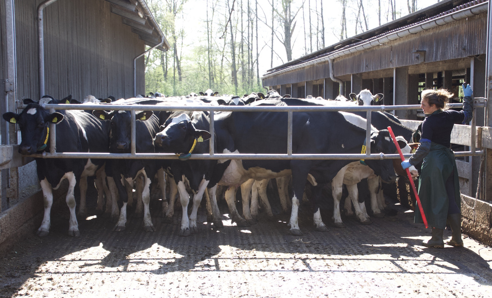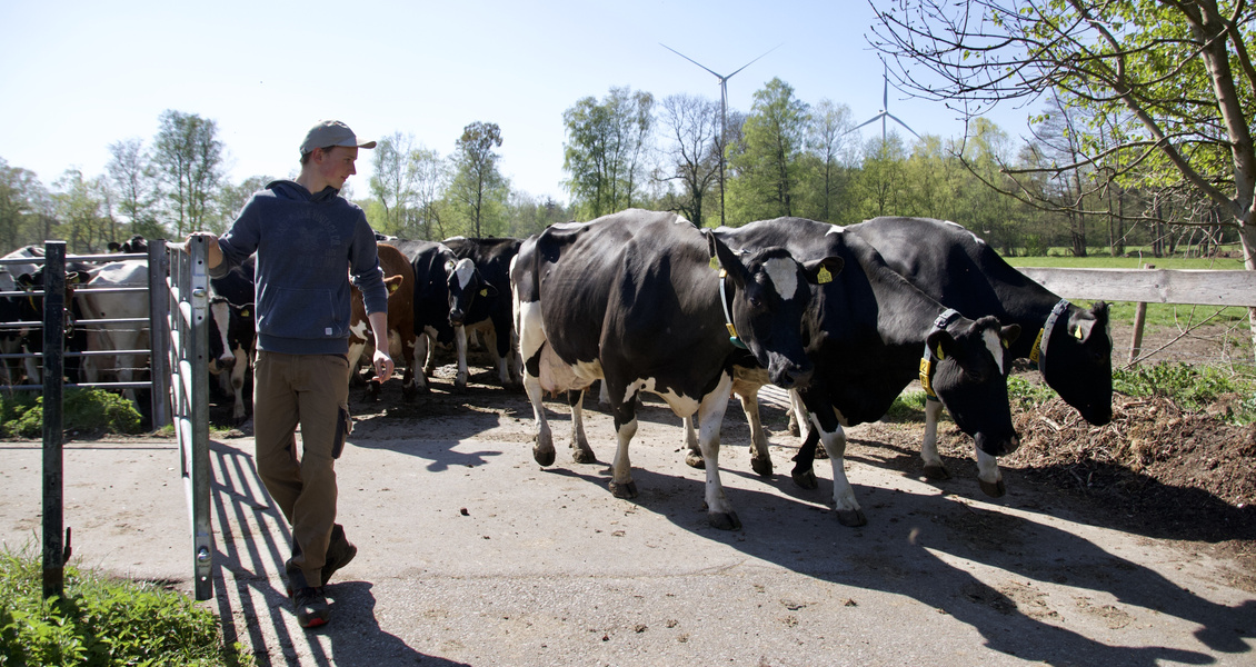 Unsere Milchviehherde (derzeit 220 Kühe) ist eine alte Zuchtherde, die schon seit der Gründung von Wilhelmsdorf als Arbeiterkolonie besteht. Die Kühe sorgen bis heute dafür, dass eine naturverträgliche Landwirtschaft auf unserem armen Sandstandort überhaupt möglich ist. Denn einerseits ernähren sie sich von den Wiesen und Weiden und den Ackerfutterpflanzen, auf der anderen Seite liefern sie wertvollen humusmehrenden Dünger für den Boden und die Pflanzen. So schließt sich der Kreislauf und die Kühe prägen und erhalten unsere Kulturlandschaft. Inzwischen liegen wir bei einem stolzen Herdendurchschnitt von über 9000 Litern. Dies erreichen wir in normalen Futterjahren ganz überwiegend mit betriebseigenem Futter. Dafür erfordert es viel Fingerspitzengefühl, Experimentierfreude und eine gute Beobachtungsgabe – ein Leben mit den Tieren. In der sommerlichen Weideperiode werden alle Jungrinder, die älter als 12 Monate sind, ganztägig auf der Weide gehalten, unsere Milchkühe halbtags. Drinnen fühlen sich unsere Kühe besonders in unserem neuen Komfortstall wohl, in dem die frischabgekalbten Kühe in einer großräumigen Liegefläche aus Stroh den Tag genießen können. Mehr Kuhkomfort geht nicht. Im „alten” Kuhstall gibt es großzügige Liegeboxen und viel frische Luft. Damit die Kühe auch im Winter Bewegung haben, gibt es einen befestigten Auslauf, der vom Stall aus ständig zugänglich ist. Über die Umstellung auf kuhgebundene Aufzucht unserer Kälber lässt sich hier sehr detailliert nachlesen.